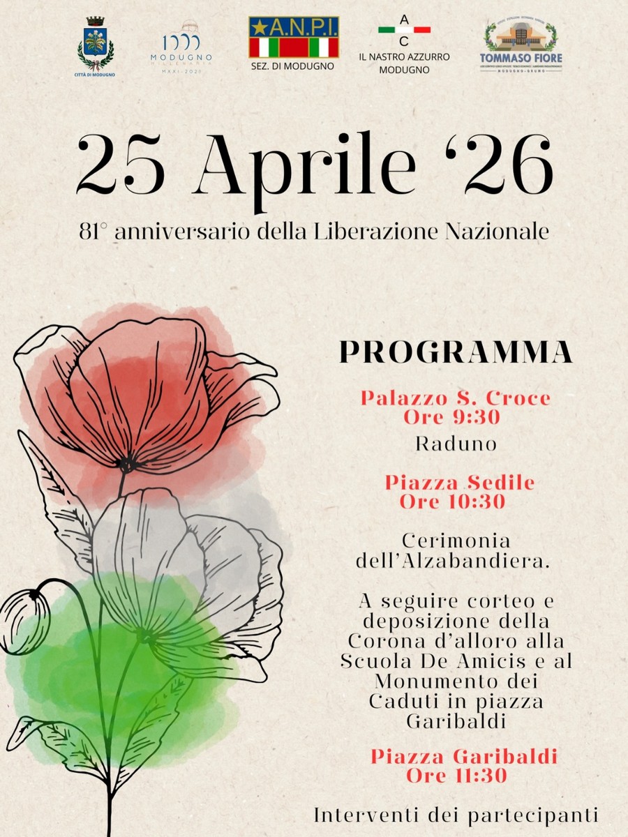 La città di Modugno celebra il 25 aprile, 81° anniversario della Liberazione Nazionale, rinnovando il proprio impegno nella custodia dei valori fondanti della Repubblica, quali la libertà, la democrazia e la partecipazione civica. La cerimonia istituzionale avrà inizio alle ore 9:30 presso Palazzo Santa Croce con il raduno delle autorità civili, militari e delle associazioni.