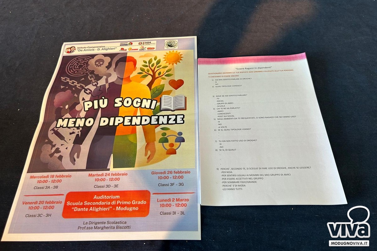 Si è svolto ieri mattina il primo di una serie di incontri dedicati alla prevenzione delle dipendenze presso la scuola secondaria di primo grado "Dante Alighieri" di Modugno. L'iniziativa, rivolta alle classi terze medie, è stata condotta dai volontari dell'O.d.V. Dico NO alla droga Puglia, attivi da oltre vent'anni nel territorio regionale con progetti di informazione e sensibilizzazione sui rischi legati all'uso di sostanze stupefacenti.