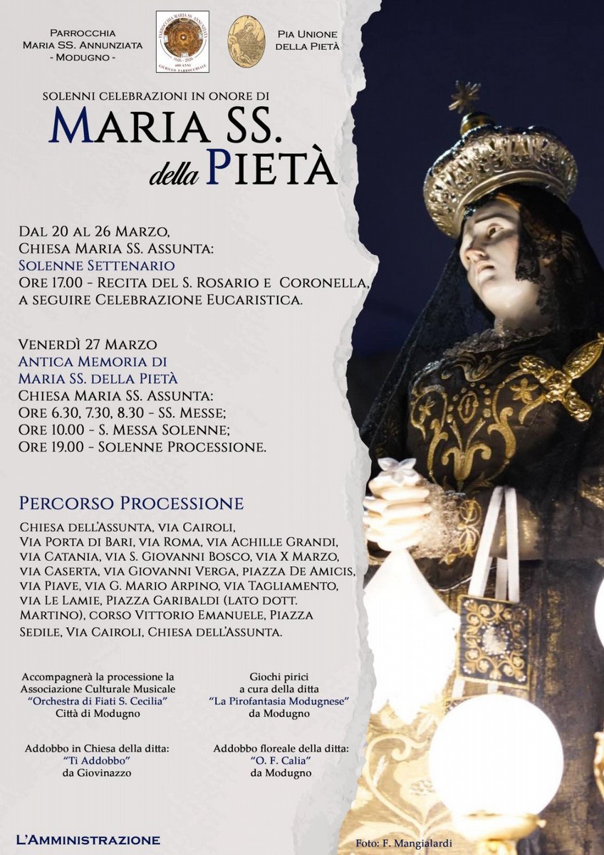 A Modugno, la Parrocchia Maria SS. Annunziata, insieme alla Pia Unione della Pietà, organizza le solenni celebrazioni in onore di Maria SS. della Pietà, un appuntamento religioso molto sentito dalla comunità locale. Il programma si apre dal 20 al 26 marzo presso la Chiesa Maria SS. Assunta con il solenne settenario: ogni giorno alle ore 17.00 si terranno la recita del Santo Rosario e la Coroncina, seguite dalla celebrazione eucaristica.