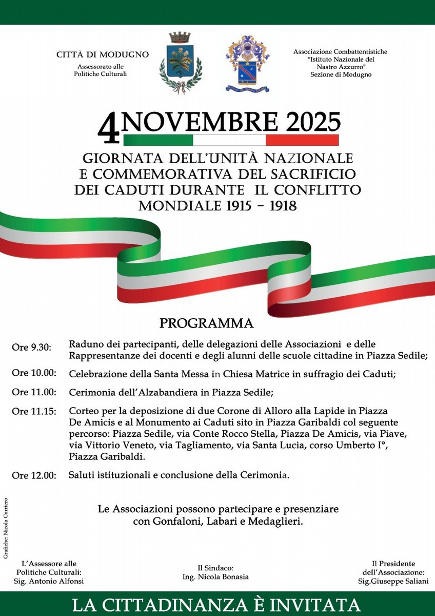Domani, 4 novembre, Modugno celebrerà la Giornata dell'Unità Nazionale e delle Forze Armate, organizzata dall'Associazione Combattentistica "Istituto del Nastro Azzurro" sez. di Modugno in collaborazione con la Città di Modugno. La mattinata si aprirà alle 9:30 in Piazza Sedile con il raduno delle associazioni, delle delegazioni e di docenti e alunni delle scuole cittadine.