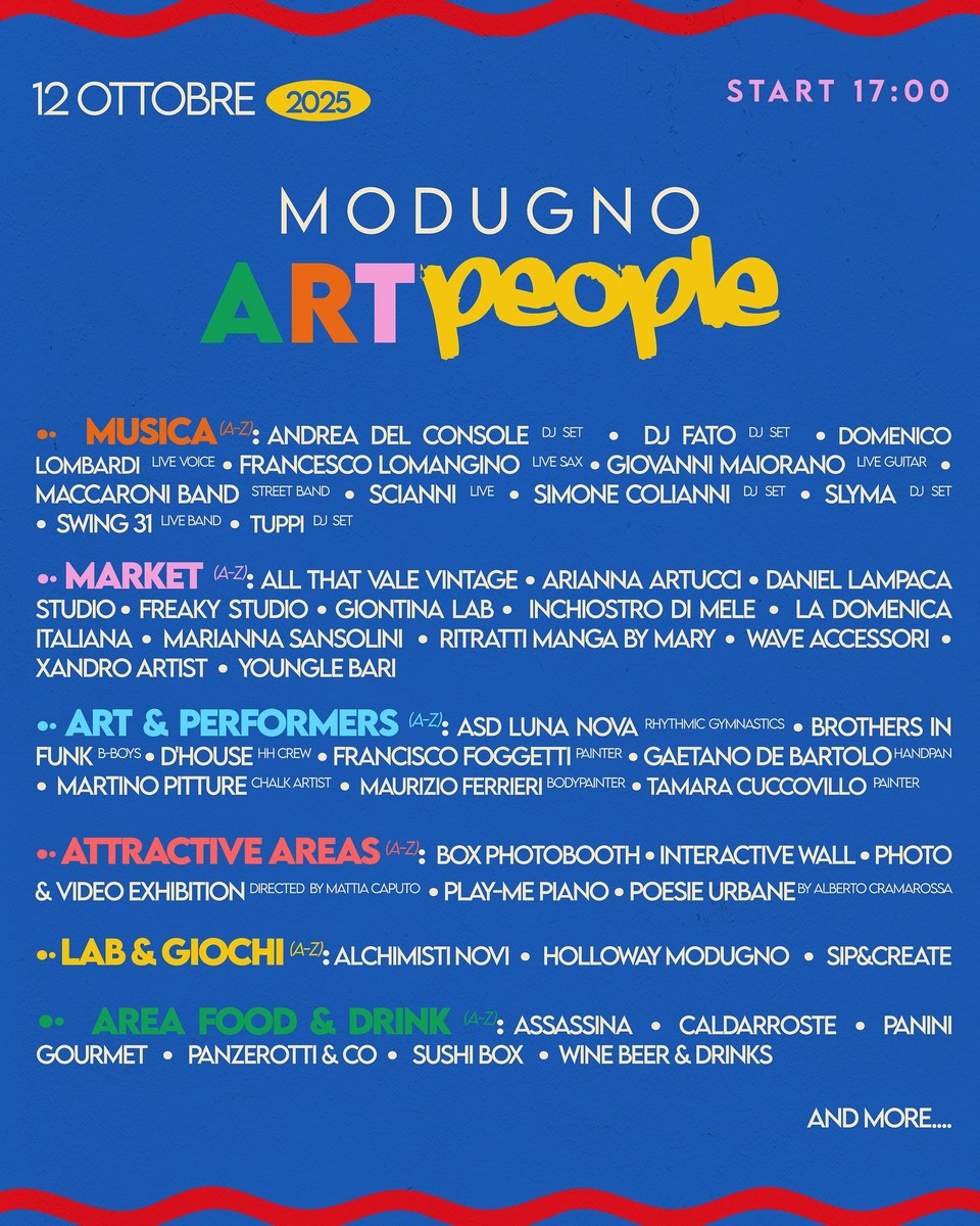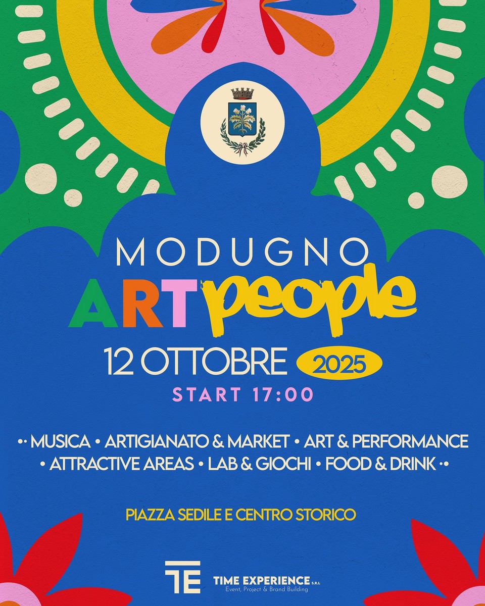 Modugno si prepara a vivere un'esplosione di creatività, musica e colori. Domenica 12 ottobre, a partire dalle 17:00, il centro storico e Piazza Sedile si trasformeranno in un grande palcoscenico a cielo aperto con Modugno ARTpeople, un evento che unisce arte, artigianato, performance, food & drinks e tanto divertimento.