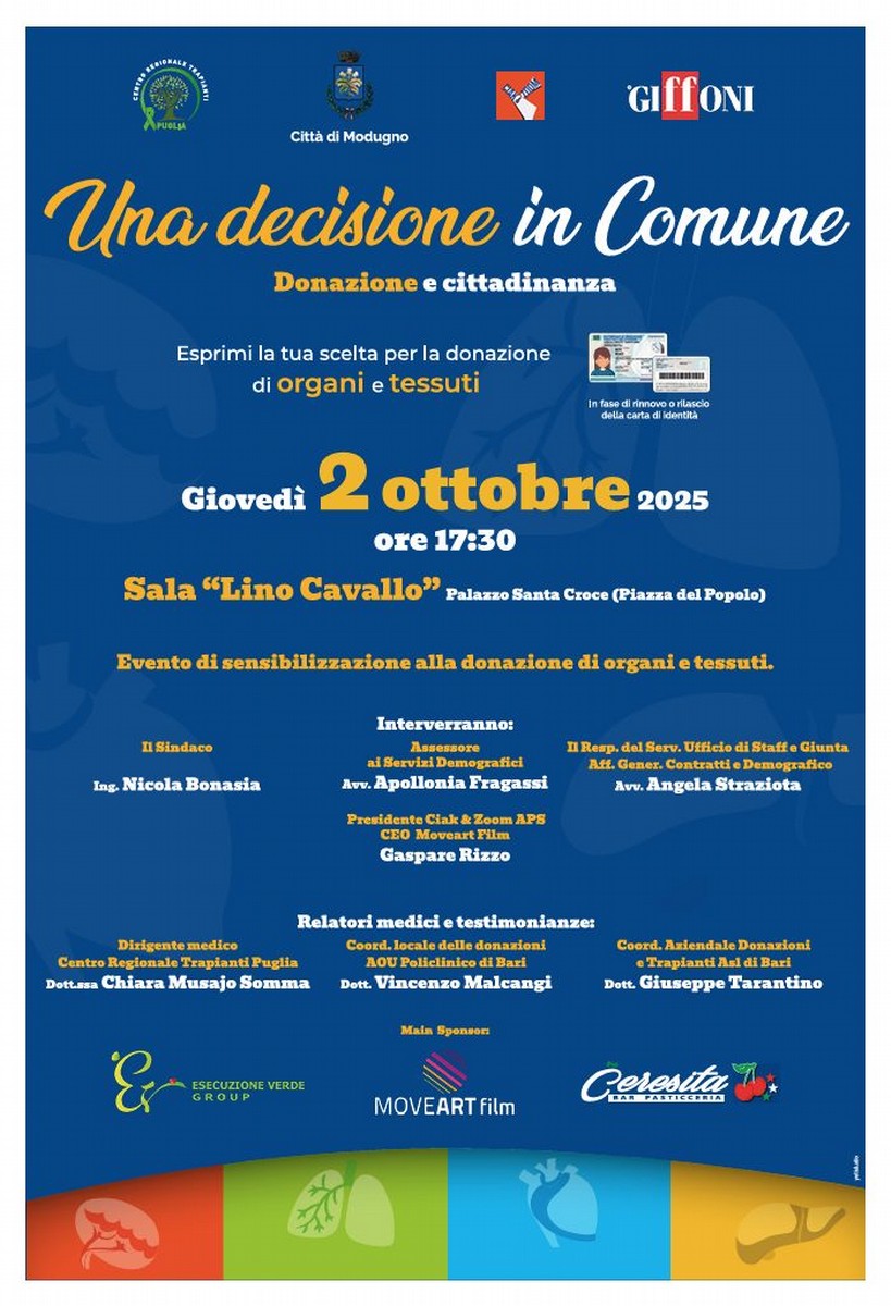Giovedì 2 ottobre 2025 alle ore 17.30, nella Sala "Lino Cavallo" presso il Palazzo Santa Croce (Piazza del Popolo a Modugno), si terrà l'incontro pubblico "Una decisione in Comune – donazione e cittadinanza", promosso dall'Amministrazione comunale – Assessorato ai Servizi Demografici con il Centro Regionale Trapianti Puglia ed in collaborazione con Ciak & Zoom e Giffoni Film Festival.