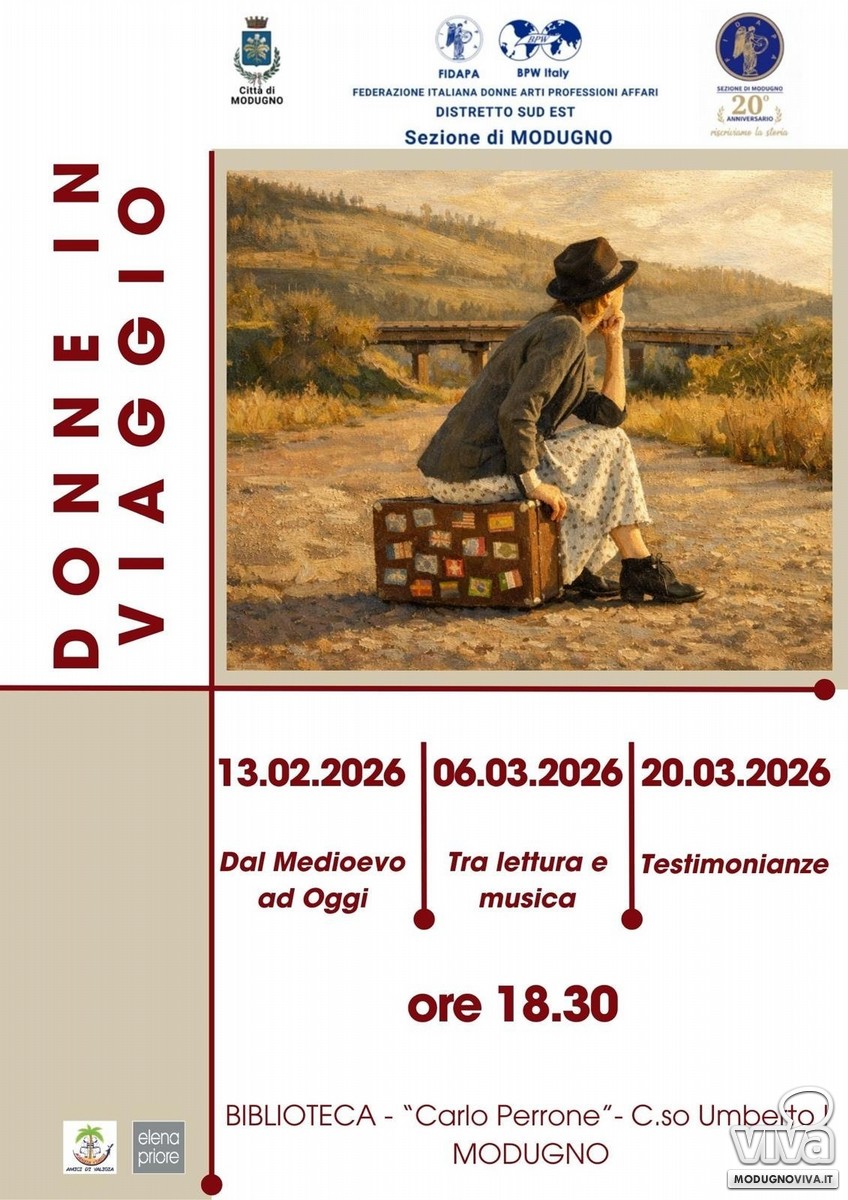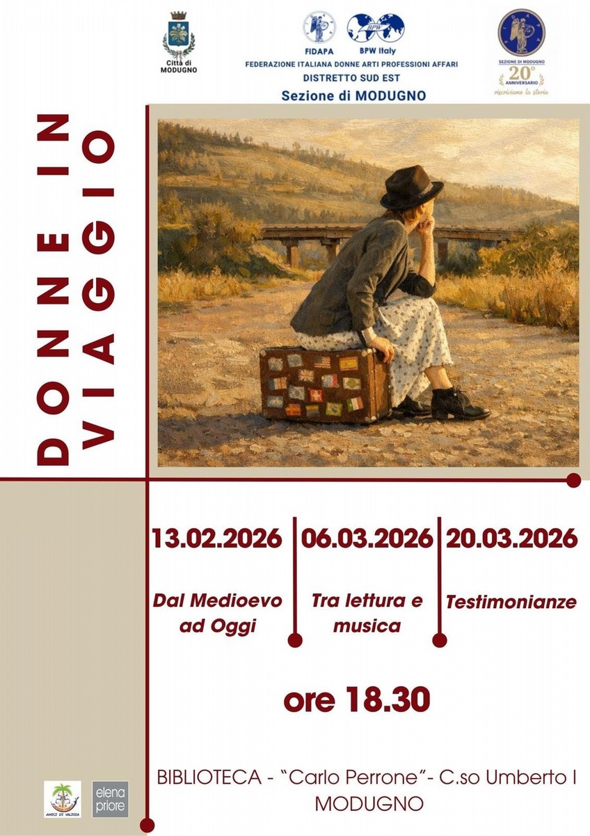 Il 13 febbraio alla Biblioteca comunale "Palazzo della Cultura", parte un progetto di Fidapa BPW Italy Sezione di Modugno. Tre incontri per ripensare il viaggio come esperienza di libertà. L'evento "Donne in viaggio" nasce come una rilettura dell'esperienza del viaggio da una prospettiva di genere. Attraverso le storie di donne viaggiatrici, il progetto mette in luce come, ancora oggi, viaggiare per le donne sia un atto complesso ma sempre più necessario.