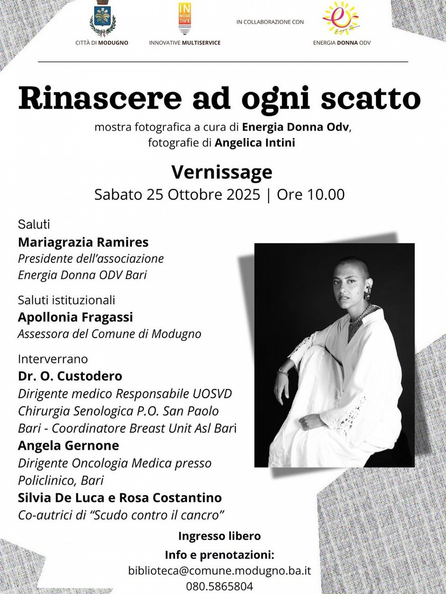 Sabato 25 ottobre, alle ore 10.00, nella Biblioteca comunale "C. Perrone" si terrà il vernissage della mostra fotografica "Rinascere ad ogni scatto", a cura dell'associazione Energia Donna ODV con le fotografie di Angelica Intini.